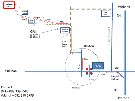 Our farm is 32km east of Pretoria on the N4, between Rayton and Cullinan. From Pretoria: 1. Take N4 east towards Witbank and turn off at the Rayton/Cullinan off ramp towards Rayton; 2. Continue straight for +/- 6km until you reach Rayton (Pick & Pay on the right). 3. Pass the robot and take the first street right (Suid St or Forfar Road). 4. Continue straight (+/-1km) with the road and turn left into (Gobey) to cross the rail road after which it become a dust road. 5. Follow the dust road for 4 km and turn left at Koos & Alet de la Rey sign board. 6. Continue straight (and keep right at the fork 400m) . 7. Pass the little stream (400m), and white house on your left (600m), and continue until you reach the maroon house (500m) on your right. 8. Turn right directly after the maroon house and drive uphill for another 600m. We are the white house on the left.